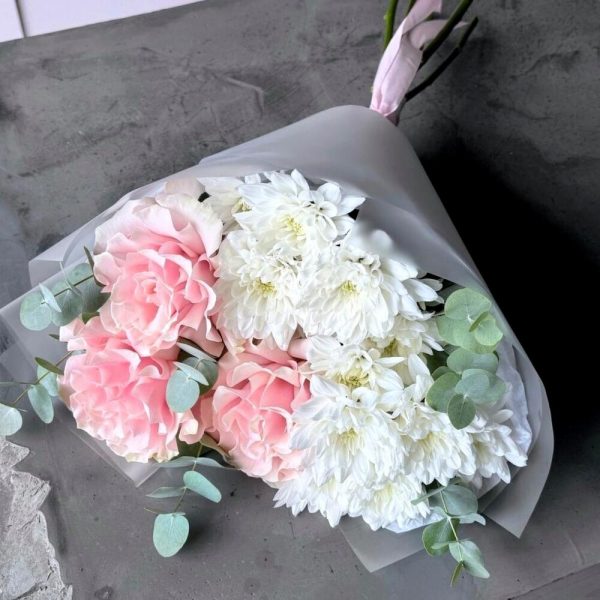 Букет из французских роз и хризантемы отлично подойдет для вашей любимой на 8 марта